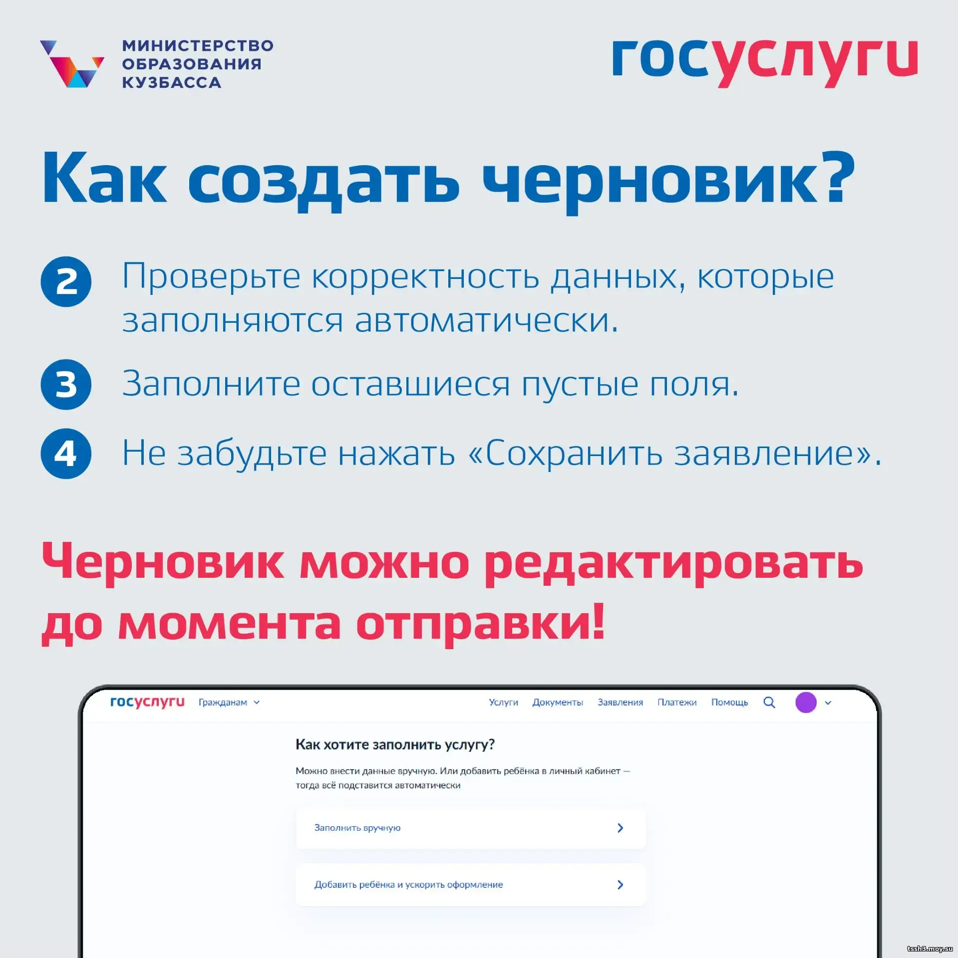 Скоро стартует приёмная кампания в первый класс — пора создать черновик заявления Уже сейчас на портале «Госуслуги» и в Электронной школе 2.0 можно оформить черновик, чтобы подать заявление сразу после открытия записи — 1 апреля. Как создать черновик? 1. На портале «Госуслуги» выберите пункт «Услуги», затем «Образование. Дети», в разделе «Школа» найдите «Запись в первый класс». 2. Проверьте корректность данных, которые заполняются автоматически. 3. Заполните оставшиеся пустые поля. 4. Нажмите «Сохранить заявление». Черновик можно редактировать до момента отправки. Сохраняйте себе, чтобы не потерять #ПолезноЗнать
