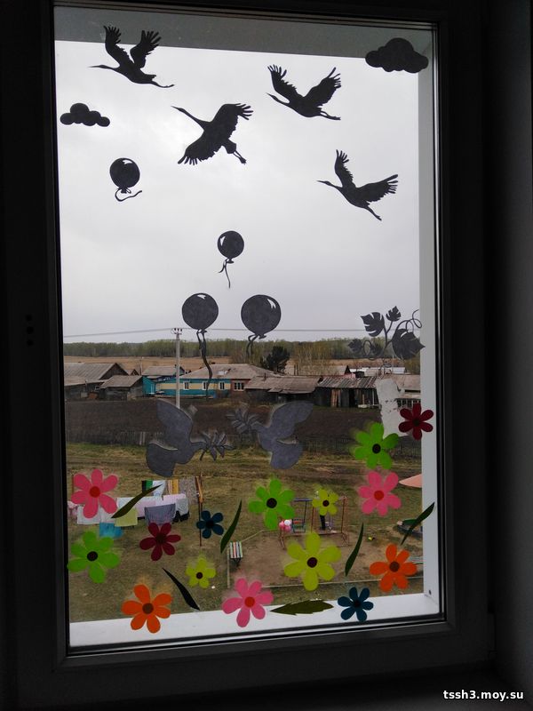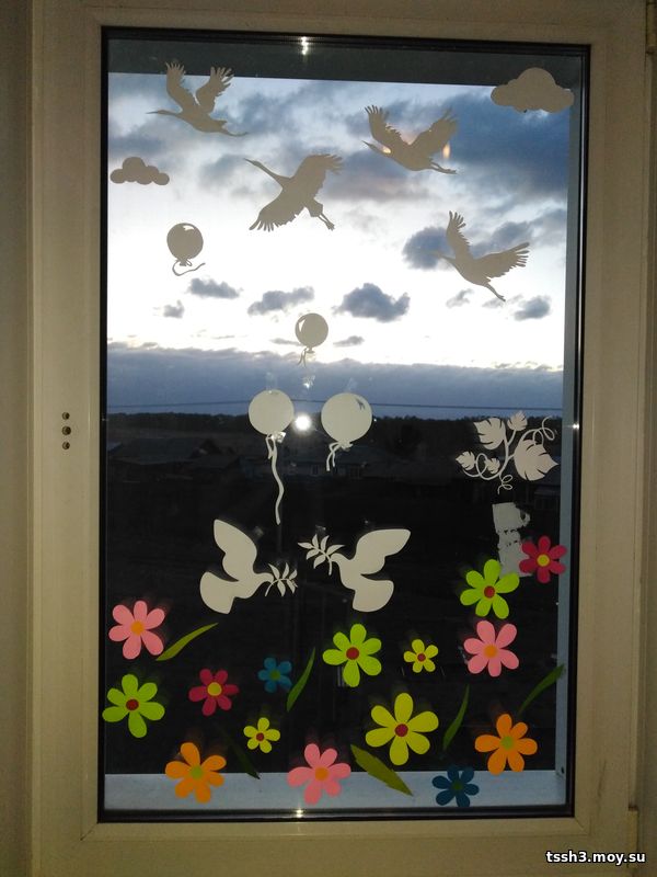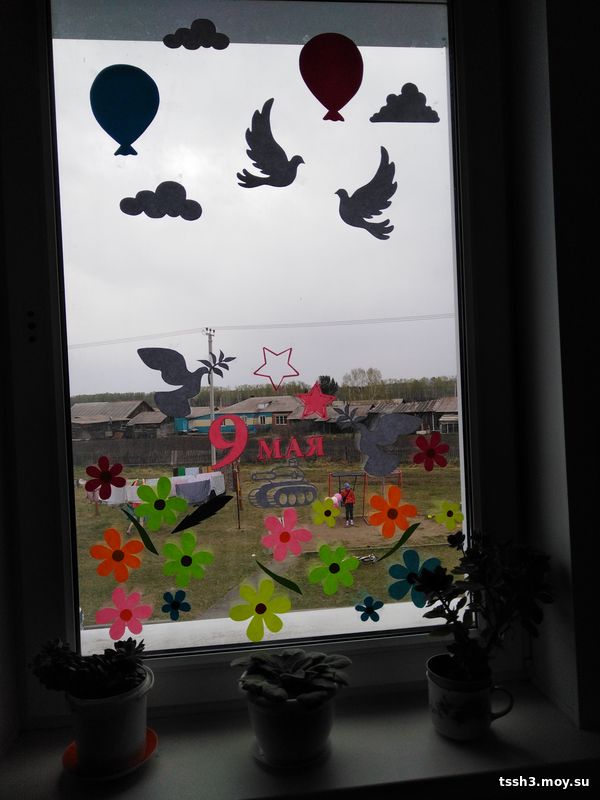 Праздничные композиции к 9 мая на окнах 2 подъезда дома 38 по улице Чехова (Кемеровская область, Тяжинский район, пгт. Тяжинский) мы с моим сыном Самойловым Богданом и соседскими ребятишками (друзьями Богдана, учениками МБОУ ТСШ № 3) Трухановым Дмитрием, Яковлевой Марией и Щучкиной Ариной подготовили, чтобы создать праздничную атмосферу в нашем доме. Особенно хотелось порадовать наших самых пожилых соседей - детей войны. Деду Ивану 82 года, а бабе Тамаре 75 лет.