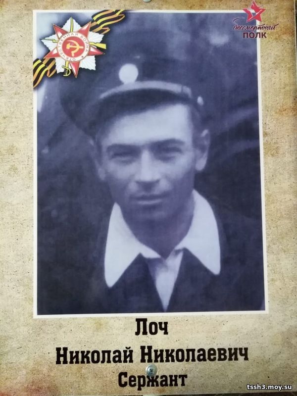 Мой прадедушка Лоч Николай Николаевич родился 15 июня 1923г. В ряды Красной армии призван 12.01.1942г. Ачинским районным военкоматом Красноярского края. Служил командиром расчёта 3 миномётной роты, 43 Гвардейской Стрелковой Дивизии, второго Прибалтийского фронта в звании младшего сержанта.
