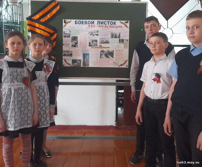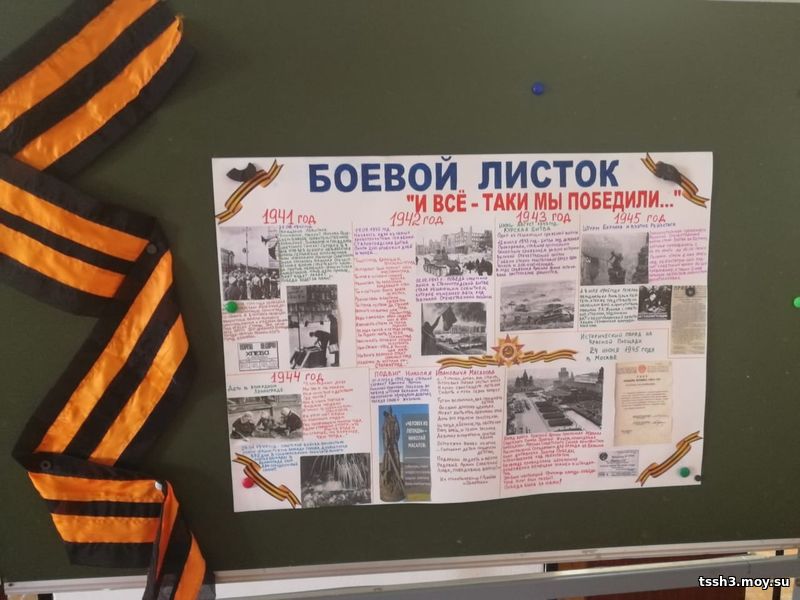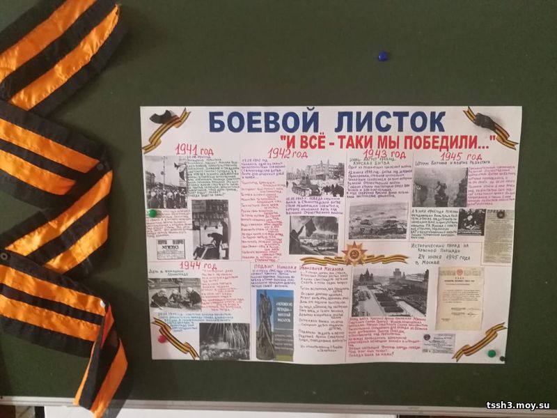 Учащиеся школы изготовили боевой листок, посвященный основным вехам Великой Отечественной войны. Изначально боевым листком назывался один из видов солдатских настенных газет. Свою популярность боевые листки получили во время Великой Отечественной войны. Использовался этот вид стенгазет для быстрого информирования армии о событиях, непосредственно связанных с боевой службой. Также нередко в таких листках призывали к успешному выполнению боевых задач.