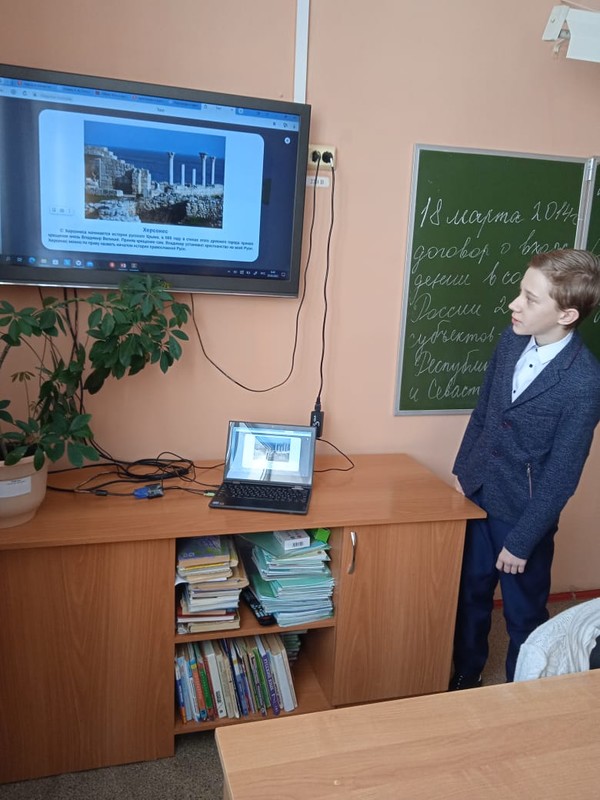 Сегодня, 20 марта, в рамках проекта Разговоры о важном в 7Бклассе прошло занятие по теме "Крымская весна - 9 лет вместе". Ребята говорили о важности воссоединения Крыма, Севастополя и России, вспомнили важное историческое событие, связанное с обороной Севастополя. Также посмотрели и обсудили ролики " Чёрное море", "Крымский мост", " Артек".