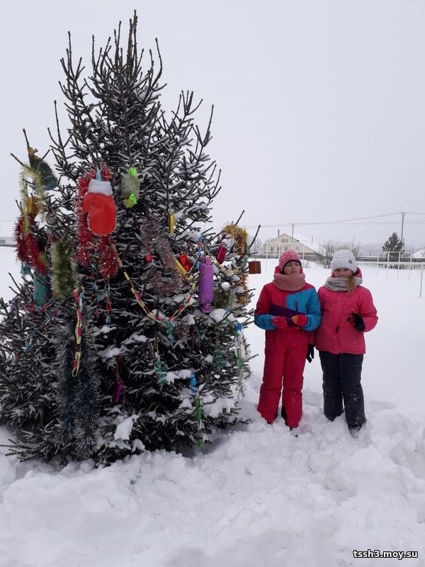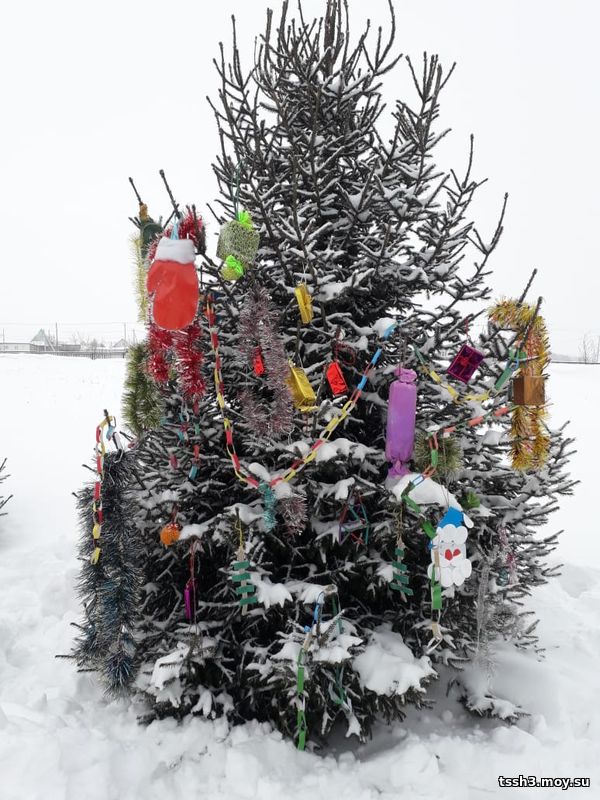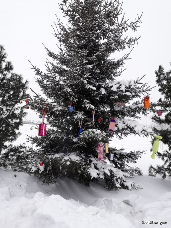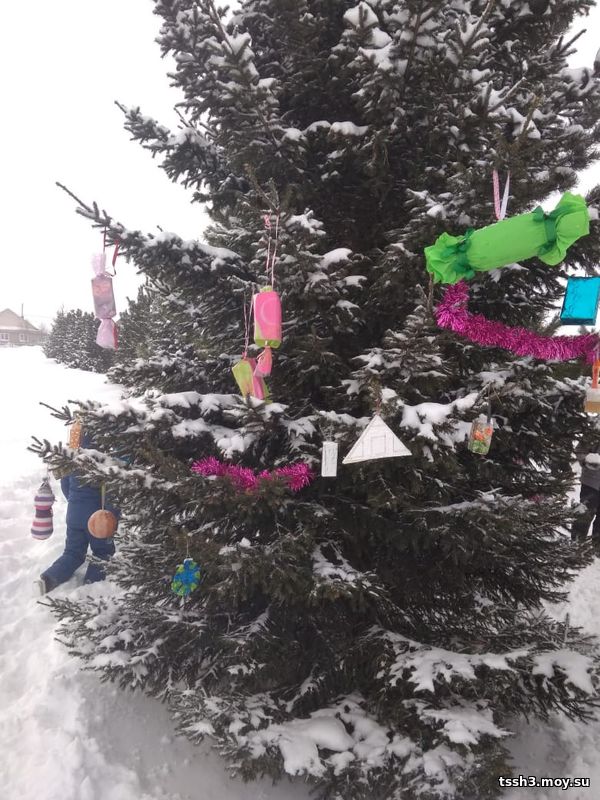 Учащиеся 1а, 1б и 4б классов, вместе с классными руководителями Филиппенко Е. В., Холомановой Е. Г., Сорока С. П. в рамках школьной природоохранной акции "Укрась живую ёлку" нарядили ели на территории школы.